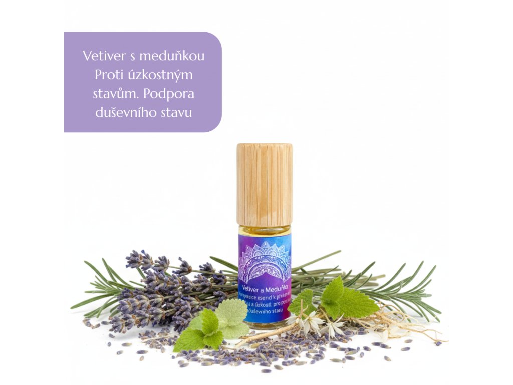 Varianta Vetiver s meduňkou - úzkost spojená s neklidem a vytěsněnou úzkostí (fialový obal). Částečně se prolíná s účinky předchozího oleje, zejména co se týká napětí a obav: