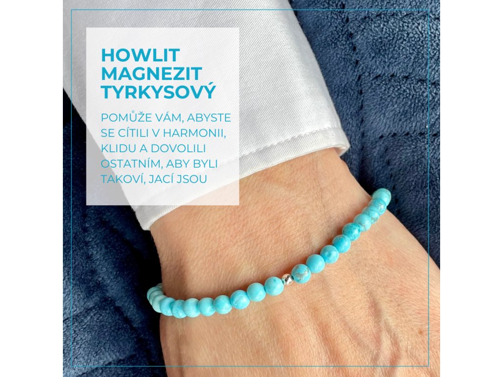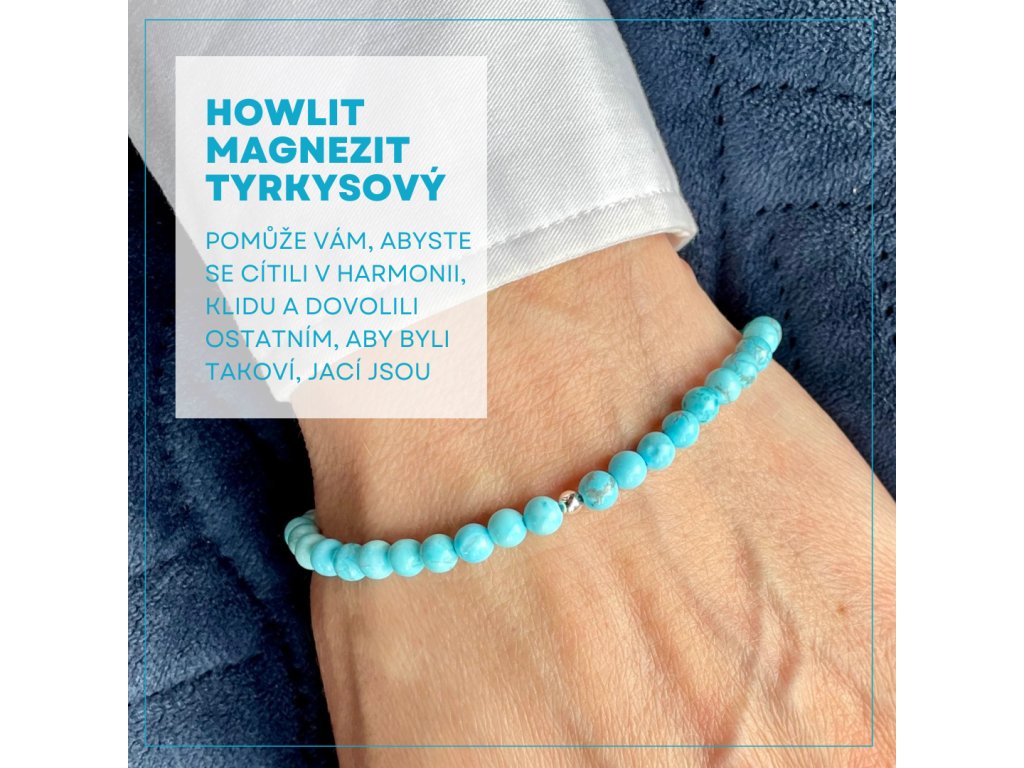 Náramek Howlite / Magnezit tyrkysový - velikost minerálu 4mm, zakončeno stříbrným korálkem 925/1000