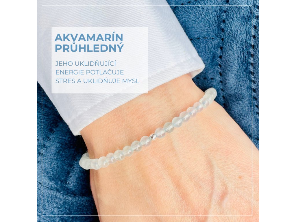 Náramek s minerálem Akvamarín průhledný - velikost korálků 4 mm, kulatý tvar, stříbro 925/100