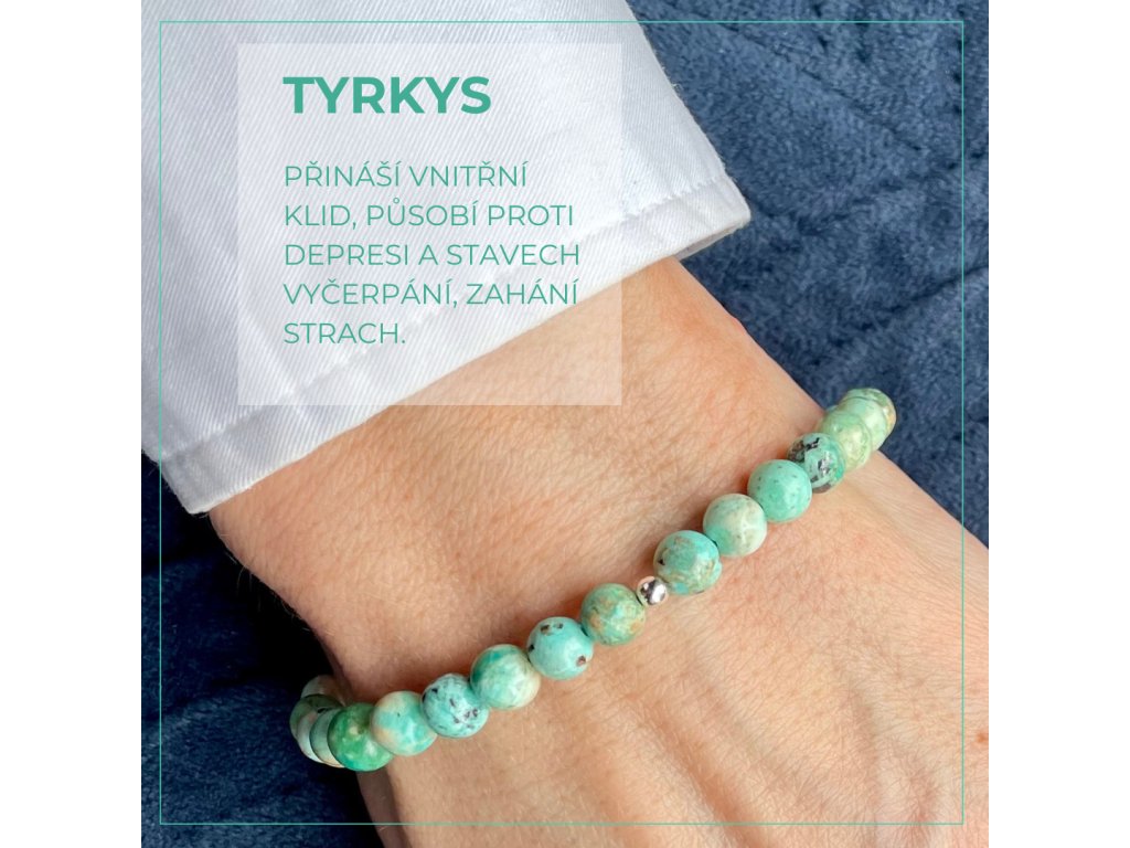 Tyrkys je kámen štěstí a zároveň nejúčinnější léčivý krystal. Vybízí k čistotě v jednání a celkovém úmyslu. Od nepaměti se jedná o ochranný kámen, využívaný též jako amulet. Umožňuje duchovní naladění a zlepšuje komunikaci mezi hmotným a duchovním světem. Obnovuje rovnováhu a uvádí do vzájemného souladu čakry společně s jemným vyšším tělem. Zajišťuje ochranu před znečištěním životního prostředí.