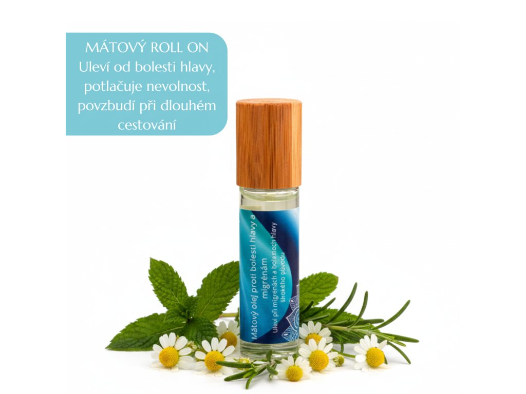 Mátový roll on proti bolesti hlavy a migrénám: Máta peprná je zde hlavní esencí. Je opravdu velmi účinná při bolestech hlavy a často s tím spojené nevolnosti. Má příjemně chladivý efekt a nedráždivou vůni. Její účinky jsou patrné také u migrény, zejména pokud na nás přichází ze stresu, přepracování, únavy a s tím spojeným napětím, ale také třeba z nesprávného stravování, což bývá také spouštěčem migrény. Detailní informace o účincích oleje naleznete zde